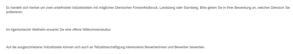Also der Agenturbezirk Weilheim scheint nach Selbsteinschätzung schon mal nicht vertreiben zu wollen (siehe Bild aus einer Stellenbeschreibung beim dortigen BA.) Daumen hoch. Aber das zeigt wohl, dass hier Agenturen ihre eigene Kultur haben. Ob das bei der Frage, ab wann man zu häufig Arbeit ablehnte eine Rolle spielt? Darf da auch jede Region ihre Kultur ausleben?